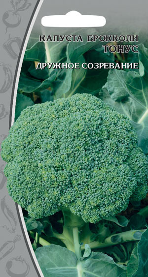 КАПУСТА брокколи Тонус - раннеспелый (60-89 дней от всходов до технической спелости) сорт. Посев на рассаду - в середине апреля. Пикировка - в фазе семядолей. Высадка в грунт - в середине мая, по схеме 50х30 см. Лист мелкий, цельный, с черешком, темно-зеленый с голубовато-сизоватым оттенком, восковой налет средний. Головка темно-зеленая, среднеплотная, высотой 5-8 см. После срезки быстро отрастают головки-отпрыски. Головки плотные, крупные, массой 160-200 г. Вкусовые качества хорошие. Сорт характеризуется дружным созреванием урожая.